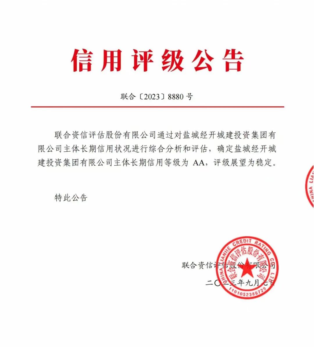 9月7日,經(jīng)國內(nèi)權(quán)威評級機構(gòu)聯(lián)合資信評估股份有限公司(簡稱“聯(lián)合資信”)綜合分析評定,鹽城經(jīng)開城投集團(tuán)成功獲評AA主體信用評級,評級展望為“穩(wěn)定”。