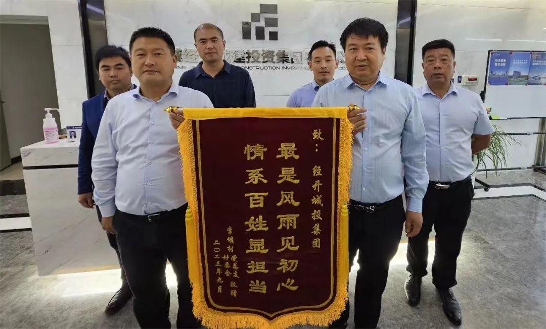 10月7日,步鳳鎮(zhèn)副鎮(zhèn)長李軍一行人送來錦旗,為鹽城經(jīng)開城投集團在仁智村、李壩村雷暴大風(fēng)天氣災(zāi)后恢復(fù)重建工作中的全力支持與幫助表示衷心感謝。