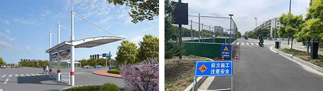 新建遮陽擋雨棚項(xiàng)目效果圖(左)與現(xiàn)場(chǎng)圖(右)