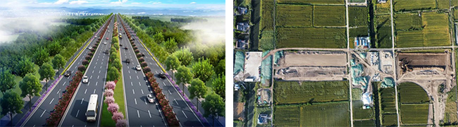 東環(huán)路南延二期項(xiàng)目效果圖(左)與現(xiàn)場(chǎng)俯瞰圖(右)