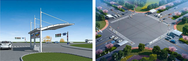 本次四座遮陽擋雨棚采用了無礙交通的設(shè)計,占地面積小,不阻礙視野,通透感十足,在保證美觀的同時,更加堅實牢固,也增強了市民朋友的視覺安全性。每個遮陽擋雨棚還設(shè)置廣告宣傳燈箱,一方面可以更好的宣傳鹽城經(jīng)開區(qū)的文明創(chuàng)建工作,讓創(chuàng)建更加深入人心;另一方面方便群眾過馬路在等候放行信號時免受日曬雨淋,便于安心等候,讓過往市民感受到城市的人文關(guān)懷。